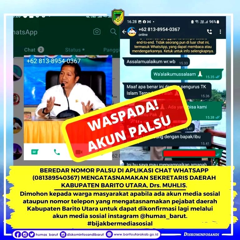 Muara Teweh – Bagi warga masyarakat di Kabupaten Barito Utara (Barut) agar selalu berhati-hati dan waspada. Ada modus penipuan melalui WhatsApp (WA) yang mengatasnamakan Sekretaris Daerah (Sekda) Kabupaten Barito Utara Drs Muhlis.